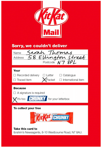 KitKat sent personalized mailers that resembled a missed package notification to potential customers. The tongue-in-cheek mailer, combined with a call to action (CTA) to collect a free candy bar, brought attention to their newest ‘chunky’ KitKat bar and gave their loyal customers a reward — free candy!