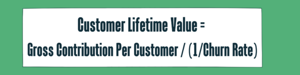 Churn rate and average subscription length are also related. A customer’s expected subscription lifetime is equal to one divided by your churn rate. We divide gross contribution per customer by churn rate as a shortcut to find the gross contribution for the whole subscription lifespan.