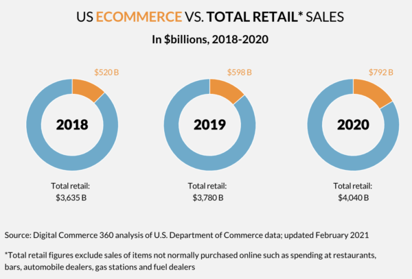 Consumers spent more than $791 billion online in 2020, according to the U.S. Department of Commerce data — per an analysis from Digital Commerce 360 — a 32.4% growth in e-commerce spending year over year.