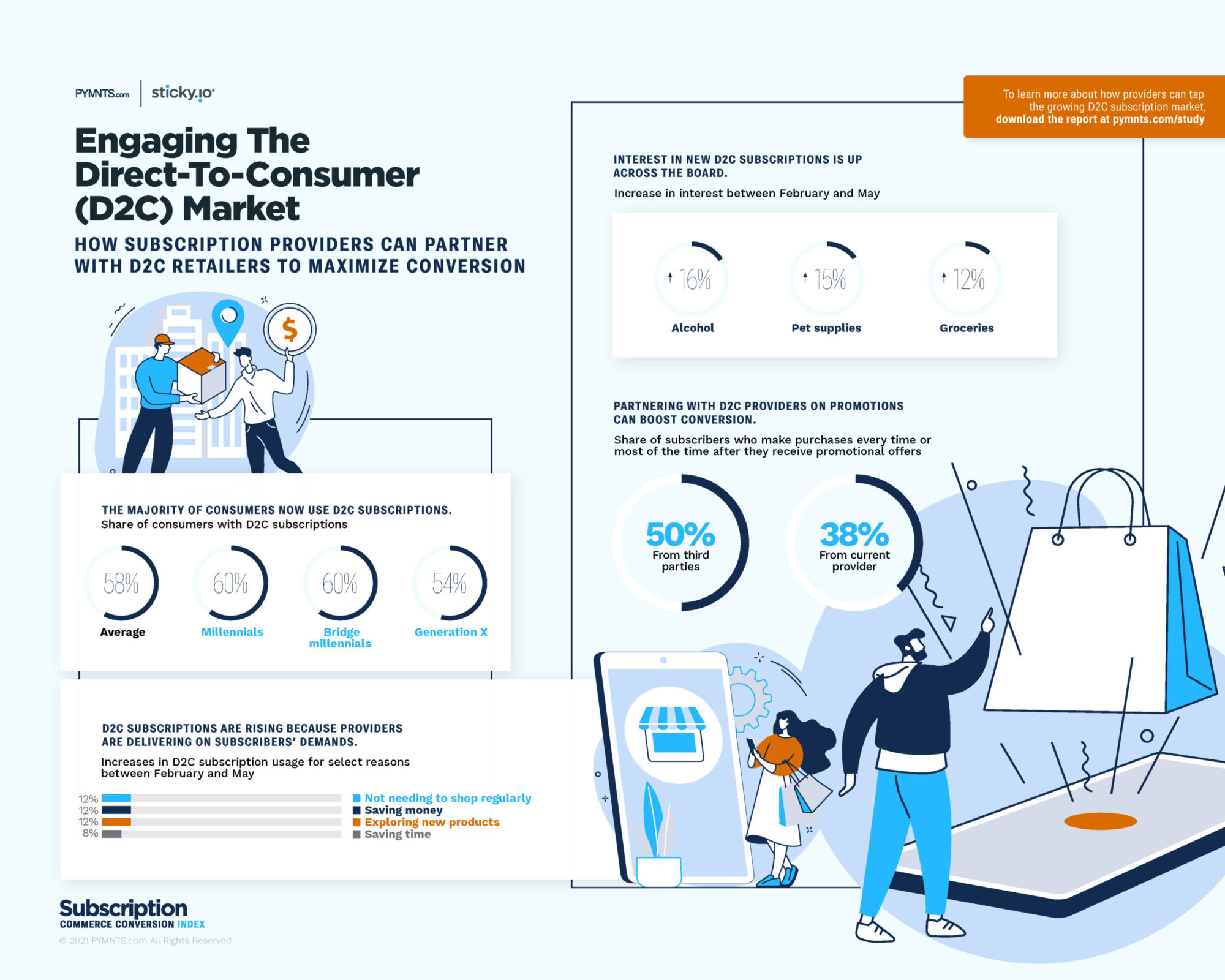 While brick-and-mortar stores may be reopening, the impact of subscription commerce won’t wane, especially among subscription-curious consumers. Fewer consumers used their subscriptions to avoid going to the store in February than in May, and more of them are also using their subscriptions to save time, conserve money, and simply to have fun.