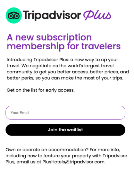 Currently, the subscription service exists on a waitlist-only basis. In the meantime, the company is working to attract hotelier interest to diversify the service’s offerings. Tripadvisor Plus is not only designed to benefit travelers, it’s also tailored for hotel companies.